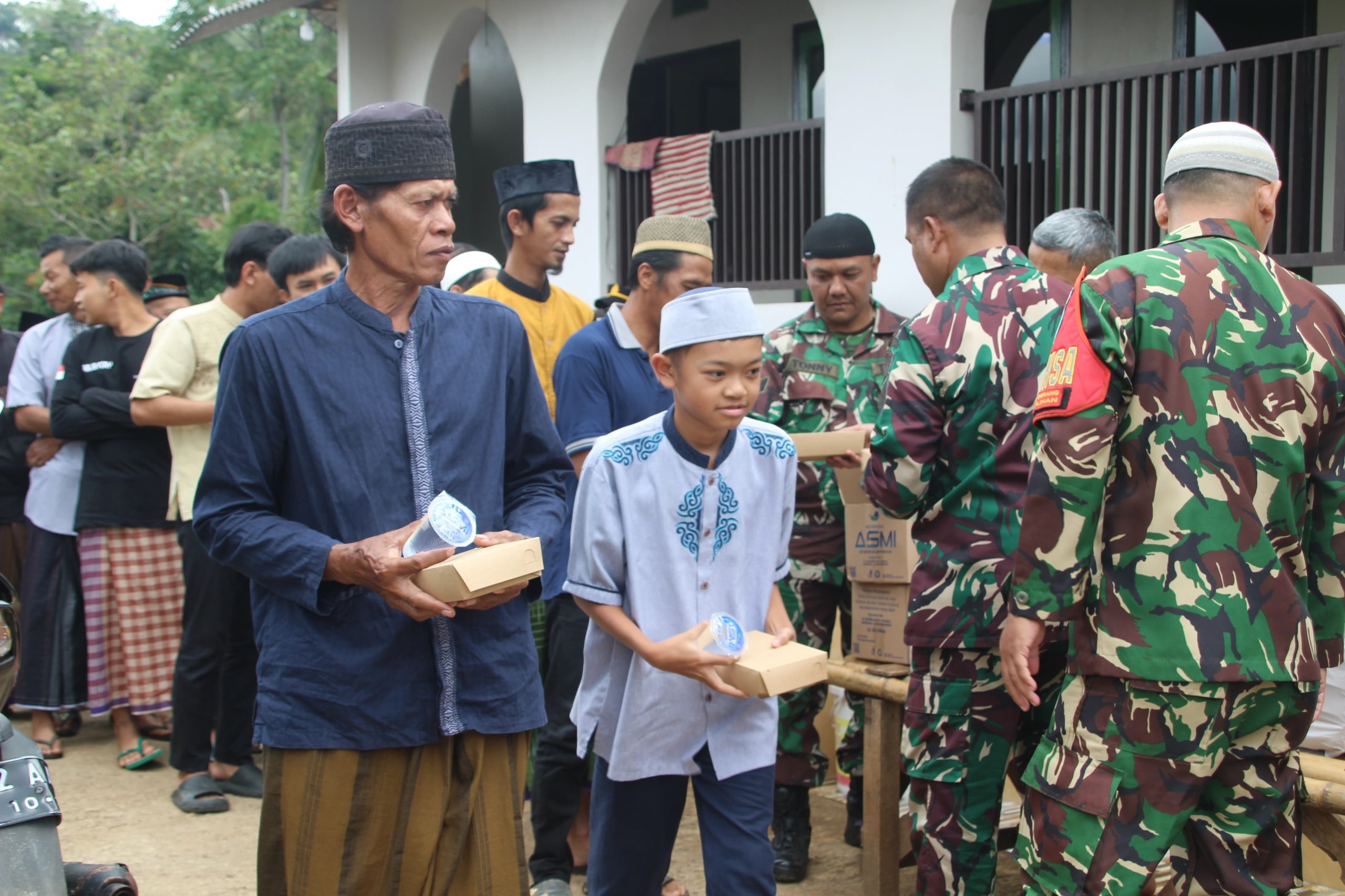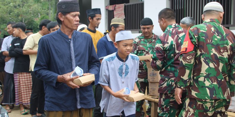 Setelah shalat, Babinsa dari Koramil 1004 Tanjungsari dan Bhabinkamtibmas Polsek Pamulihan membagikan 100 kotak makan siang dan kue kepada warga dan anak-anak yang mengikuti kegiatan Shalat Jum’at.