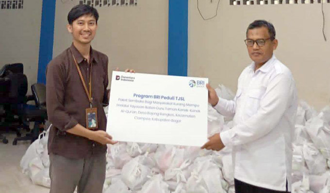 BOGOR, INDONEWS — Bank Rakyat Indonesia (BRI) Cabang Bogor Dewi Sartika menyalurkan bantuan program BRI Peduli Tanggung Jawab Sosial Lingkungan (TJSL) berupa 5.000 paket sembako ke Yayasan Ikatan Guru Taman Kanak-kanak Al Qur’an di Desa Bojong Rangkas, Kecamatan Ciampea, Kabupaten Bogor.