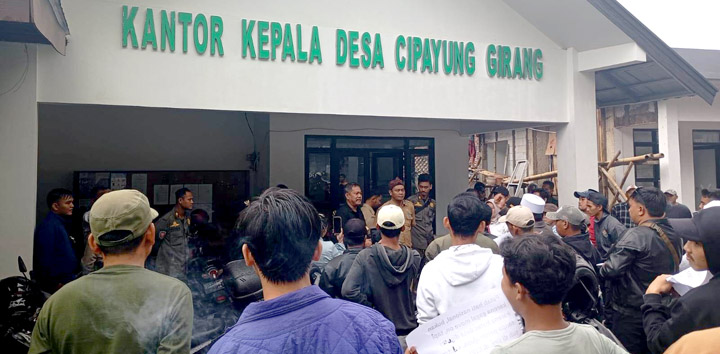 Saat di kantor desa, warga berteriak meminta Kades Cipayung Girang Hj. Srie Budi Sayekti dan Camat Megamendung untuk hadir langsung atau tidak diwakilkan saat demo.