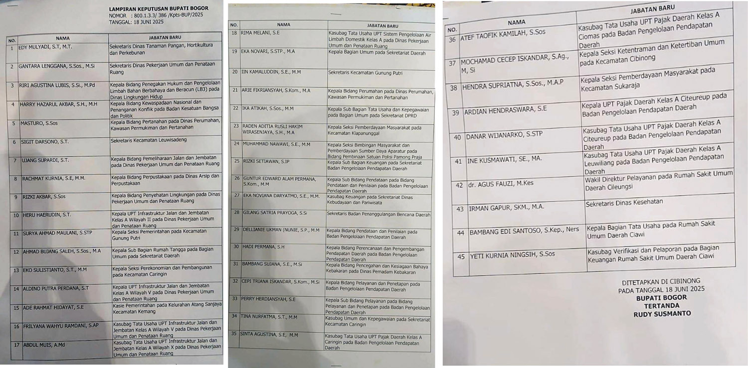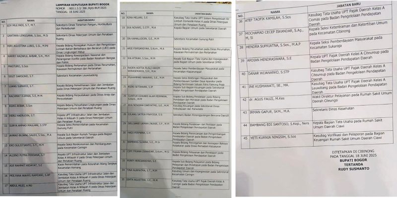 Dikutip dari website resmi Pemkab Bogor setda.bogorkab.go.id, pelantikan ini telah mendapatkan izin pengangkatan dan pelantikan dalam jabatan dari Menteri Dalam Negeri berdasarkan Surat Menteri Dalam Negeri Nomor 100.2.2.6/3341/OTDA, tanggal 10 Juni 2025, tentang Persetujuan Pengangkatan dan Pelantikan Pejabat Administrator dan Pejabat Pengawas di Lingkungan Pemerintah Daerah Kabupaten Bogor.