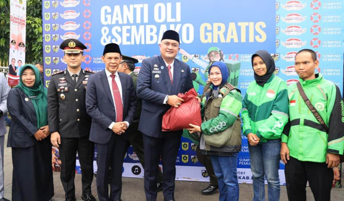 Pada kesempatan tersebut, Komite Nasional Pemuda Indonesia (KNPI) Kabupaten Bogor menyelenggarakan ganti oli dan pembagian sembako gratis untuk para pengemudi ojek online. (didi/ist)