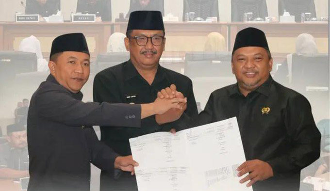 Pada kesempatan tersebut dilaksanakan penandatangan berita acara persetujuan bersama dan penyerahan keputusan DPRD. (Ndi)