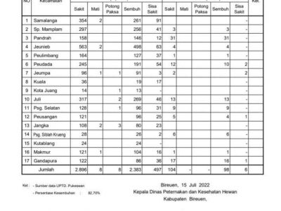 BIREUEN, INDONEWS – Dinas Pertenakan dan Kesehatan Hewan Kabupaten Bireuen mengimbau masyarakat peternak tetap waspada. Sebab, kasus Penyakit Mulut dan Kuku (PMK) pada ...