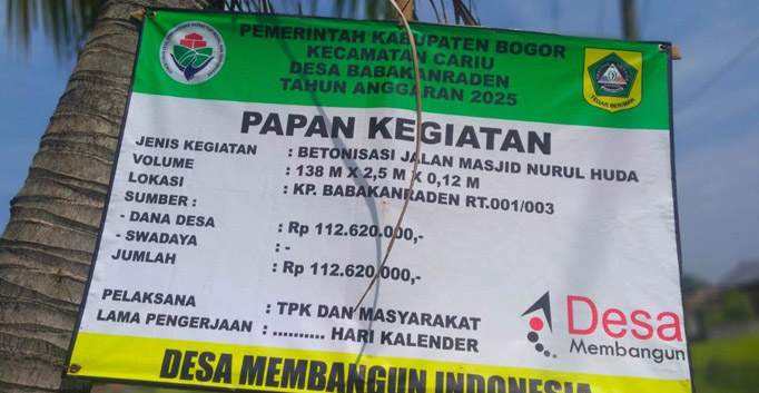 Seperti dana desa yang dialokasikan untuk pembangunan infrastruktur jalan di Kampung Babakanraden, RT 01/03, Desa Babakanraden, Kecamatan Cariu.