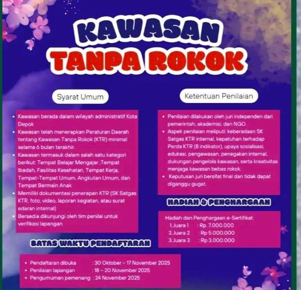 DEPOK, INDONEWS — Dinas Kesehatan (Dinkes) Kota Depok kembali mengadakan Kawasan Tanpa Rokok (KTR) Award 2025, yang dimeriahkan dengan berbagai lomba untuk tujuh kategori kawasan bebas rokok.