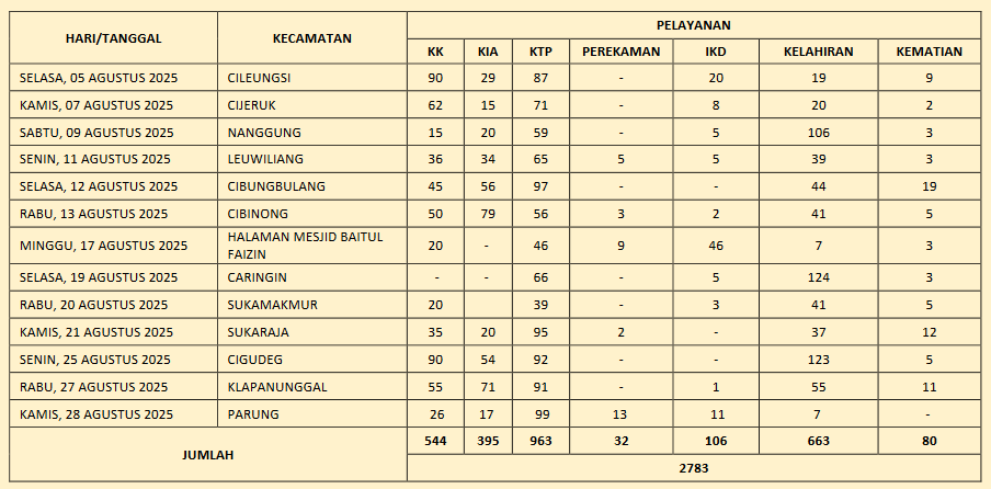 “Sebagai salah satu perwujudan Visi Misi daerah serta rangkaian Program Kunjungan Kerja Bupati/Wakil Bupati Bogor dalam Rangka Peringatan Hari Ulang Tahun (HUT) Kemerdekaan RI Ke-80 di Kabupaten Bogor, Maka Dinas Kependudukan dan Pencatatan Sipil turut berpartisipasi dalam rangka Gebyar Pelayanan Terpadu yang diselenggarakan di beberapa kecamatan,” jelas Renaldi.