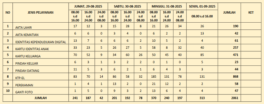 Hasilnya, sebanyak 2.061 layanan adminduk berhasil diselesaikan selama kegiatan berlangsung, seperti yang terlampir pada tabel berikut: