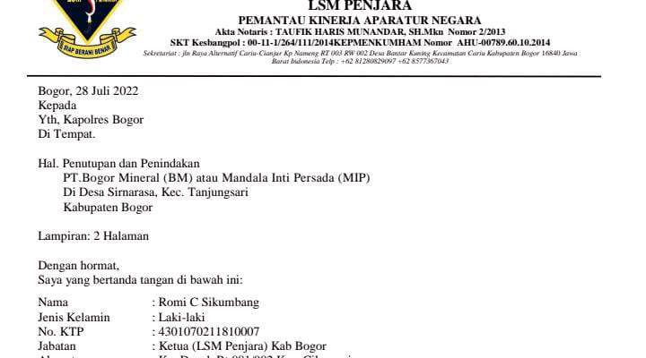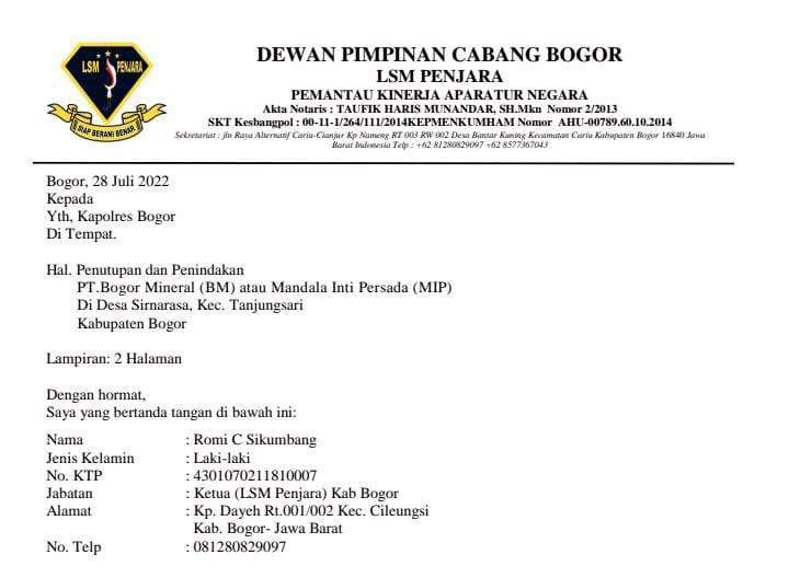Ketua DPC LSM Penjara Kabupaten Bogor, Romi Sikumbang mengatakan, perusahaan perkebunan pertambangan yang beroperasi di Desa Sirna Rasa, Kecamatan Tanjung Sari, Kabupaten Bogor itu dilaporkan karena diduga tidak memiliki Izin Bangunan (IMB),  Analisis Mengenai Dampak Lingkungan (Amdal), tidak memiliki izin lingkungan serta melakukan praktik kejahatan perusakan lingkungan.
