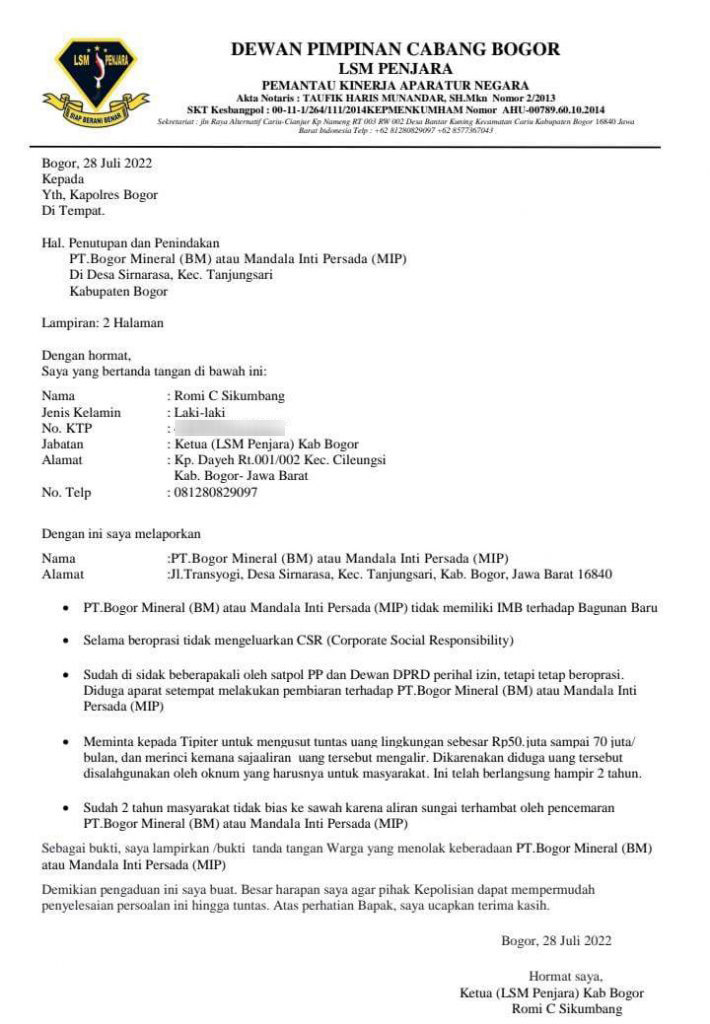 “Itu alasan yang menjadi dasar pertimbangan kami untuk melaporkan PT. MIP ke Tipiter Polres Bogor karena dugaan tindak pidana pengrusakan alam dan penambangan liar,” ujar Romi.