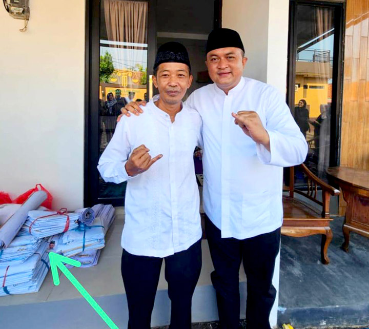 Foto Rudy Susmanto bersama salah satu kepala desa seraya menunjukan satu jari seolah simbol 01. Dibelakangnya (tanda panah hijau) diduga alat peraga kampanye Rudy Susmanto