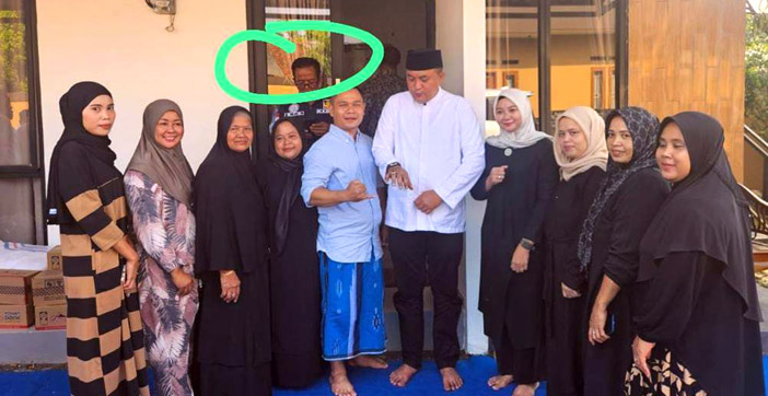 Bahkan pada foto lainnya, ditandai jika ada alat peraga kampanye yang diduga spanduk Rudy Susmanto-Jaro Ade dibelakang mereka saat berfose.