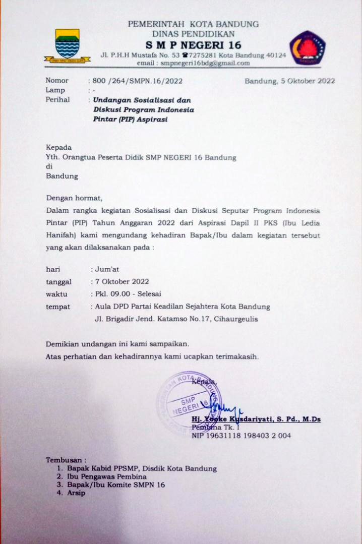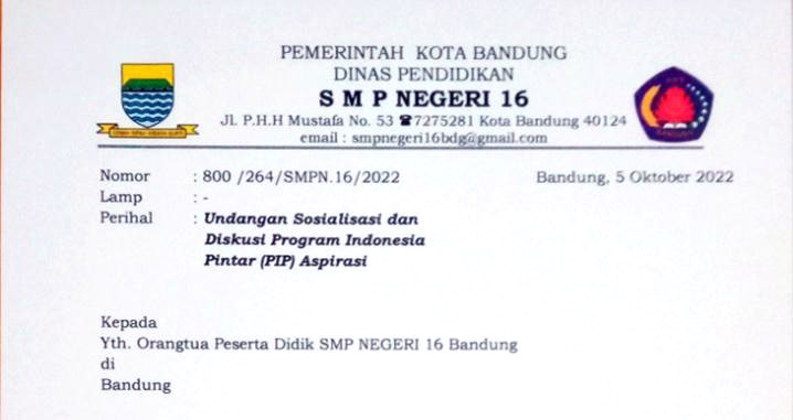 Ketua Fortusis, Dwi Subawanto mengutarakan,pada Jumat, 7 Oktober 2022 beredar undangan dari SMPN 16 Kota Bandung yang isinya mengajak orang tua siswa/peserta didik untuk mengikuti sosialisasi tentang Program Indonesia Pintar (KIP).