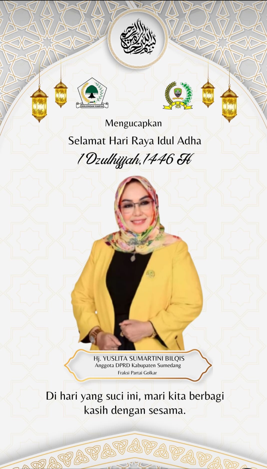 Senada dengan Asep, Anggota Fraksi Golkar yang juga menjabat sebagai anggota DPRD Sumedang Dapil III, Hj. Yuslita Sumartini Bilqis mengajak masyarakat untuk menjadikan Iduladha sebagai momen berbagi dengan sesama, terutama kepada mereka yang membutuhkan, melalui ibadah kurban dan kegiatan sosial lainnya.