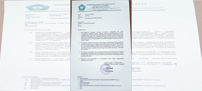“Pemerintah Gampong Batee Tunggai mencabut dan menyatakan tidak berlaku lagi Surat Rekomendasi Nomor 541.13/201/2025 tanggal 27 Agustus 2025 kepada PT Empat Pilar Bumindo,” tulis surat tersebut.