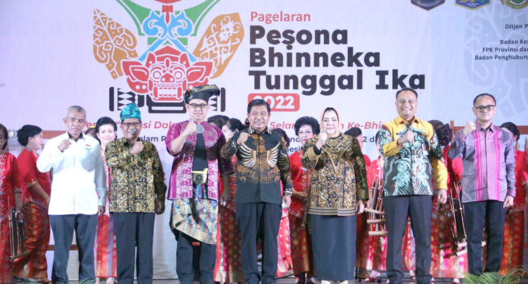 Penyelenggaraan Pagelaran Pesona Bhinneka Tunggal Ika ini dalam rangka memperingati bulan Pancasila 2022 dan mendukung gerakan Indonesia bersatu. Selain memamerkan kekayaan budaya dari Sabang hingga Merauke, gelaran ini juga diisi dengan berbagai perlombaan seni budaya. (Sumber: Puspen Kemendagri/Firm)