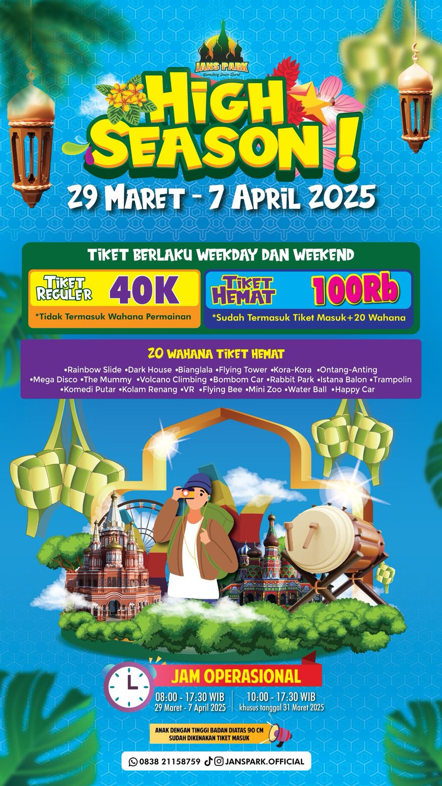 SUMEDANG, 2 April 2025– Jatinangor National Park (Jans Park) Sumedang kembali memanjakan pengunjung dengan promo spesial menyambut libur Lebaran 2025. Mengusung tema “High Season!”, promo ini berlaku mulai tanggal 29 Maret hingga 7 April 2025, menawarkan harga tiket spesial dan beragam wahana menarik.