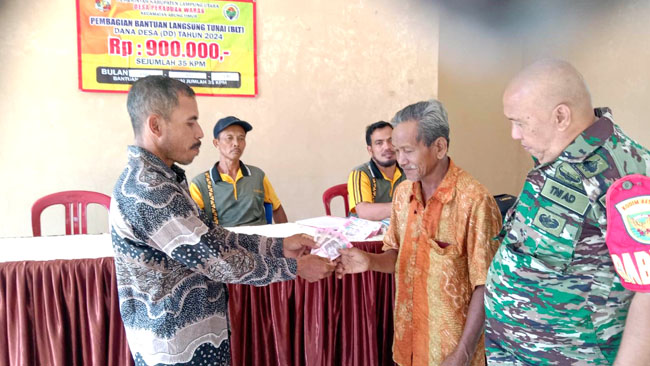 LAMPUNG UTARA, INDONEWS | Bantuan Langsung Tunai Dana Desa (BLT-DD) untuk 35 Keluarga Penerima Manfaat (KPM) di Desa Peraduan Waras, Kecamatan Abung Timur, Kabupaten Lampung Utara disalurkan, ini Jumat (14/6).