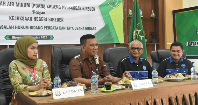 Kepala Kejaksaan Negeri Bireuen Munawal Hadi, S.H.,M.H menyampaikan adapun MoU ini bertujuan untuk merumuskan langkah-langkah dalam melakukan kegiatan terkait bidang hukum Perdata dan Tata Usaha Negara antara Perusahaan Daerah Air Minum (PDAM) dengan Kejaksaan Negeri Bireuen selaku Jaksa Pengacara Negara yang meliputi kegiatan Bantuan Hukum, Pertimbangan Hukum, Pelayanan hukum dan Tindakan Hukum lainnya.