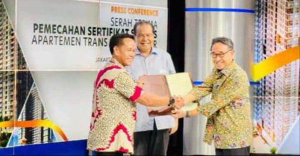 DEPOK, INDONEWS | Badan Pertanahan Nasional (BPN) Kota Depok secara resmi menyerahkan 3.216 unit sertifikat Apartemen Trans Icon di kawasan Transpark Cibubur.