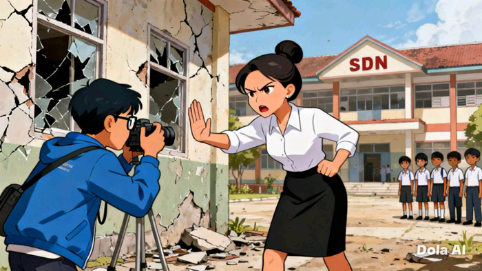 Gedung Rusak, Gaji Honorer Tersendat, Ditanya  Anggaran BOS, Kepsek: Itu Urusan Inspektorat, Media Tidak Punya Hak, Jangan Ambil Gambar