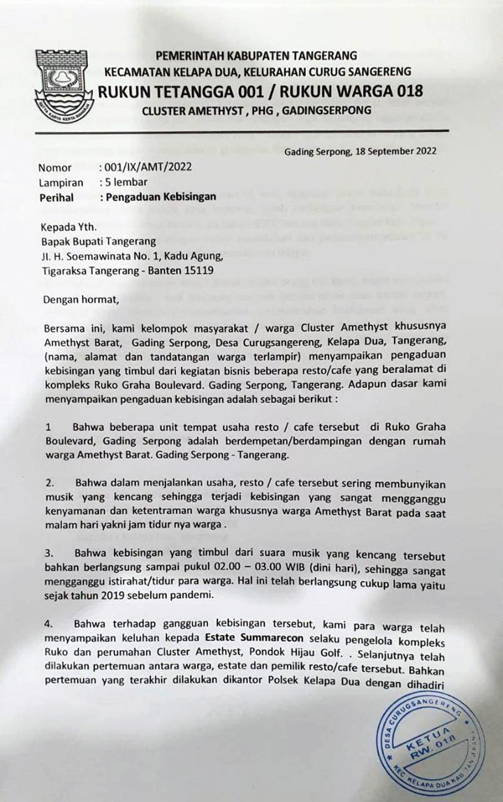 TANGERANG, INDONEWS – Masyarakat Cluster Amethys, Kelurahan Curug Sengereng, Kecamatan Kelapa Dua mengadu ke Pemerintah Kabupaten Tangerang. Mereka mengaku terganggu karena suara bising hingga getaran dinding yang ditimbulkan Cafe Kwang Koan Kopi Johny Gading Serpong, Jl. Raya Bluevard Gading Serpong.