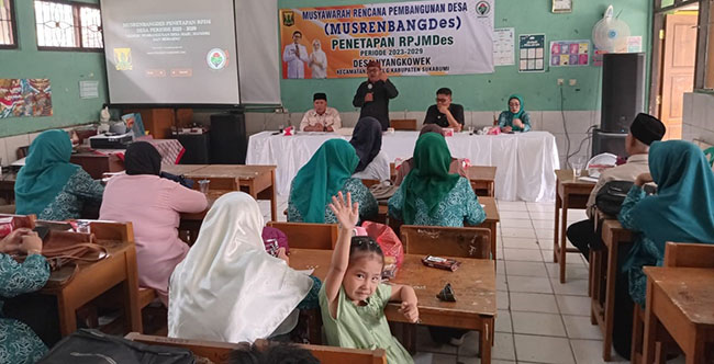 SUKABUMI, INDONEWS – Pemerintah Desa Nyangkowek menggelar Musyawarah Rencana Pembangunan (Musrenbang) sekaligus membahas Penetapan Rencana Pembangunan Jangka Menengah (RPJM) Desa Nyangkowek tahun 2023-2029, di SDN Nyangkowek, Desa Nyangkowek, Kecamatan Cicurug, Kabupaten Sukabumi, Kamis (4/1/2024).