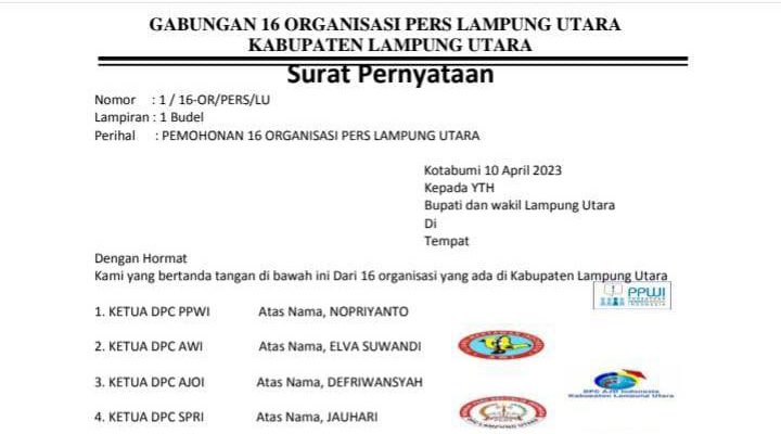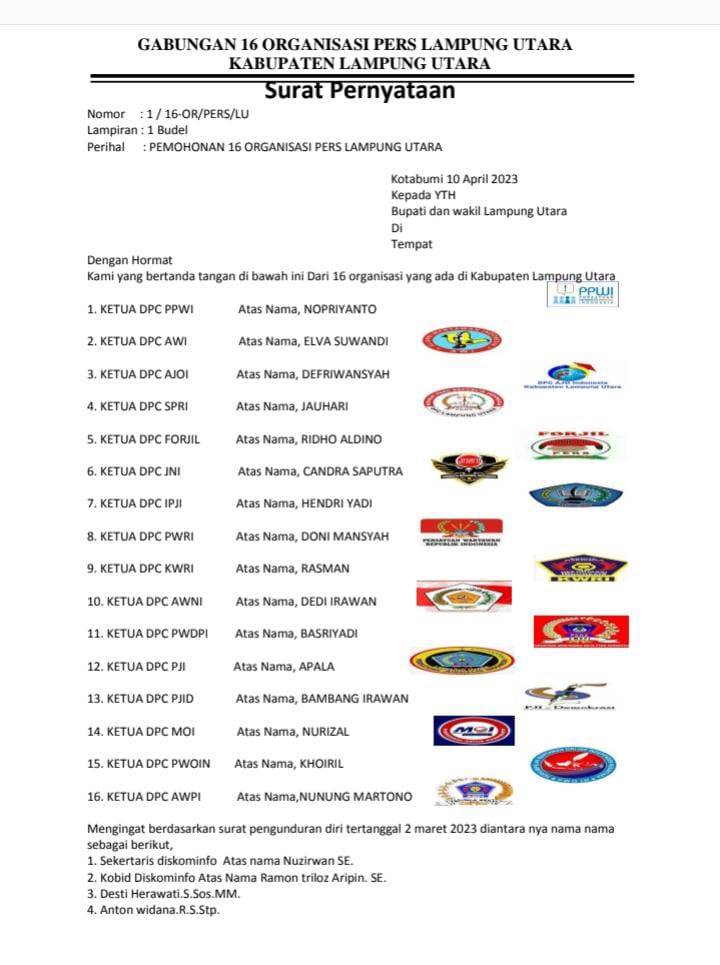 Ke 16 organisasi profesi dalam surat ditujukan ke Pemkab Lampung Utara tersebut, terdiri dari Ketua DPC PPWI atas nama, Nopriyanto, Ketua DPC AWI atas nama Elva Suwandi, Ketua DPC AJOI atas nama Defriwansyah, Ketua DPC SPRI atas nama Jauhari, Ketua DPC FORJIL atas nama Ridho Aldino, Ketua DPC JNI atas nama Candra Saputra, Ketua DPC IPJI atas nama Hendri Yadi, Ketua DPC PWRI atas nama Doni Mansyah.