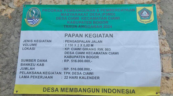 Sementara itu, proyek kedua berlokasi di RW 002, dengan panjang jalan 1.800 meter, lebar 2 meter, dan ketebalan 2 cm. Proyek ini diselesaikan dalam 20 hari kalender dengan anggaran Rp 456 juta.
