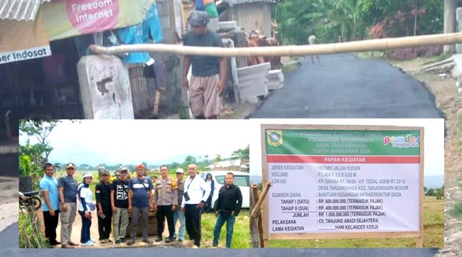 Hotmix jalan desa di Kampung Darma RT 09/05 – Kampung Tegal Asem RT 23/12 dengan volume panjang 1.404 meter x lebar 2,5 meter x tinggi 0,03 dengan anggaran Rp 600.000.000.