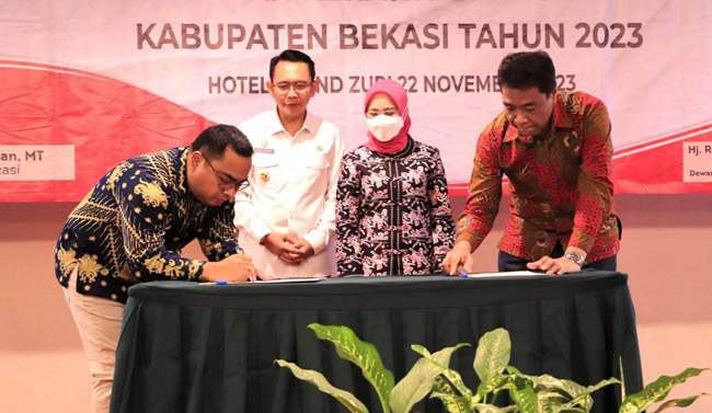 Penandatanganan dilakukan oleh Ketua Umum Dekranasda Kabupaten Bekasi, Ria Sabaria Dani Ramdan bersama Manajemen Aeon Mall Deltamas yang disaksikan langsung oleh Pj Bupati Bekasi Dani Ramdan pada Rakerda Dekranasda Kabupaten Bekasi di Hotel Grand Zuri, Jababeka, Cikarang Selatan, pada Rabu (22/11/2023).