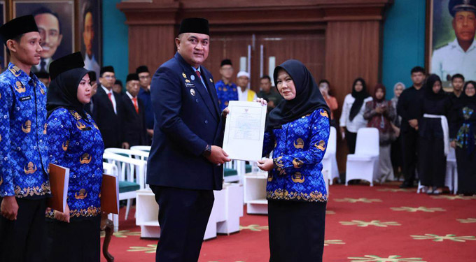 BOGOR, INDONEWS — Bupati Bogor Rudy Susmanto melantik sekaligus menyerahkan Surat Keputusan pengangkatan Pegawai Pemerintah dengan Perjanjian Kerja (PPPK) penuh waktu tahap II lingkup Pemerintah Kabupaten (Pemkab) Bogor, di Gedung Tegar Beriman, Cibinong, Kamis (2/10).