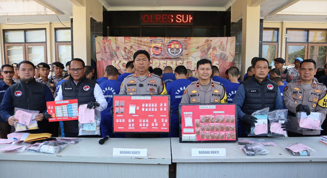 “Dari pengungkapan tersebut, Sat Res Narkoba Polres Sukabumi berhasil menyita barang bukti berupa sabu seberat 184 gram dengan nilai estimasi Rp220.800.000, serta narkotika jenis tembakau sintetis seberat 46,3 gram yang diperkirakan senilai Rp4.630.000. Selain itu, obat keras terbatas yang berhasil disita berjumlah 2.101 butir dengan nilai sekitar Rp21.010.000,” beber Samian.