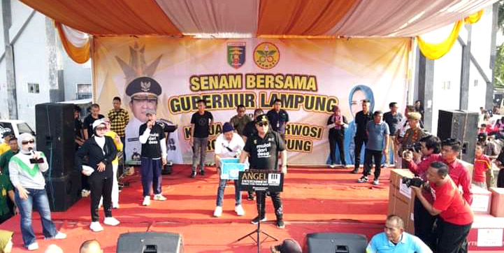 Olahraga berupa senam Berjaya Lampung ini, Arinal didampingi Ketua Umum Perwosi Provinsi Lampung Riana Sari, dan Pj. Bupati Lampung Utara Aswarodi.