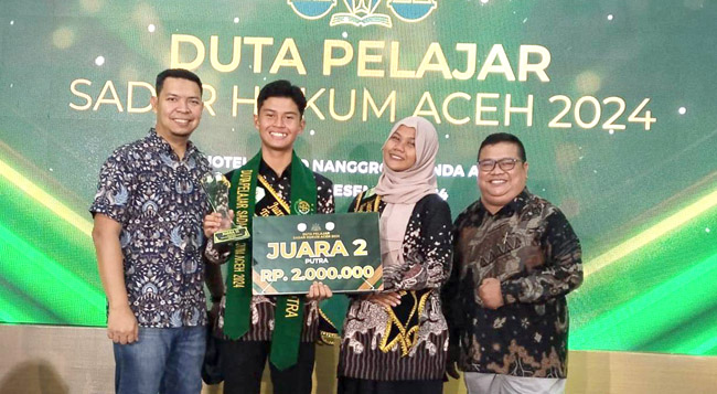 BIREUEN, INDONEWS | Siswa SMA Negeri 1 Bireuen, Muhammad Afgan berhasil meraih Juara Kedua Putra sebagai Duta Pelajar Sadar Hukum Provinsi Aceh tahun 2024, setelah mengikuti seleksi ketat yang diselenggarakan oleh Kejaksaan Tinggi Aceh bekerja sama dengan Dinas Pendidikan Aceh sejak tanggal 8 Desember 2024 sampai dengan tanggal 10 Desember 2024 di Hotel Grand Nanggroe Banda Aceh.