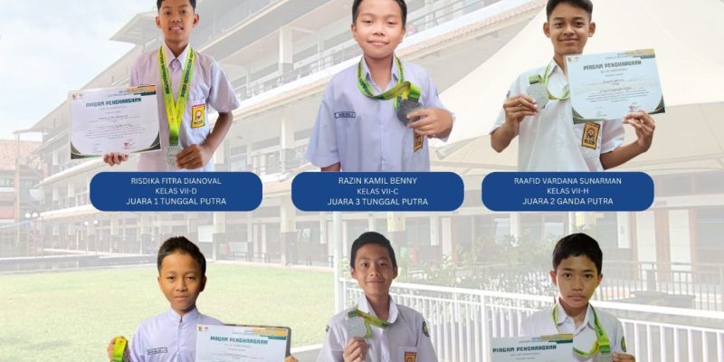 Sedangkan Raafid Vardana Sunarman dan Andrea Trianggara (keduanya kelas VII-H) meraih juara 2 Ganda Putra, dan juara 3 Tunggal Putra oleh Razin Kamil Beny (VII-C), Luqman Maulana (VII-A), dan Azka Argani (VII-G).