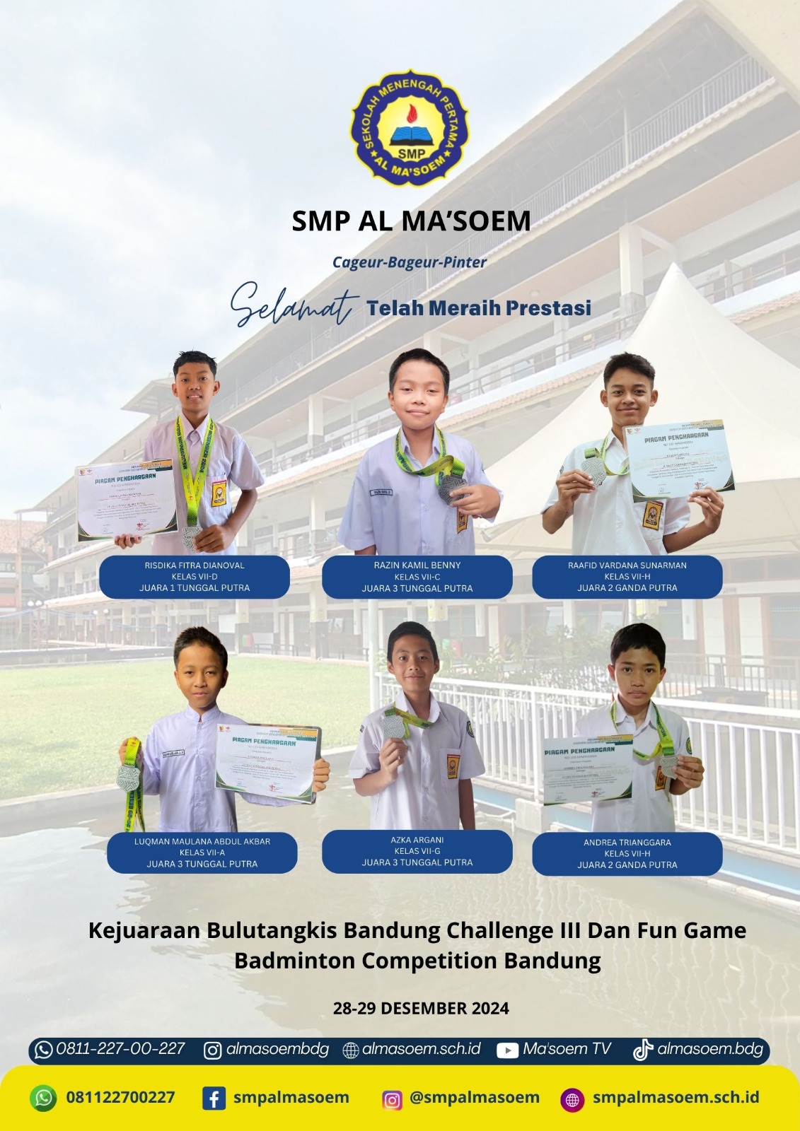 Dalam gelaran Kejuaraan Bulu Tangkis Bandung Challenge III dan Fun Game Badminton Competition Bandung pada 28-29 Desember 2024, para atlet muda SMP Al Ma’soem berhasil menyabet berbagai gelar juara.