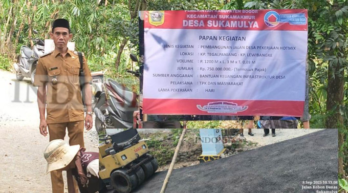 BOGOR, INDONEWS | Pemerintah Desa Sukamulya, Kecamatan Sukamakmur, Kabupaten Bogor merealisasikan Bantuan Keuangan (Bankeu) Insfrastruktur Desa tahun 2025 dengan menghotmix jalan desa.