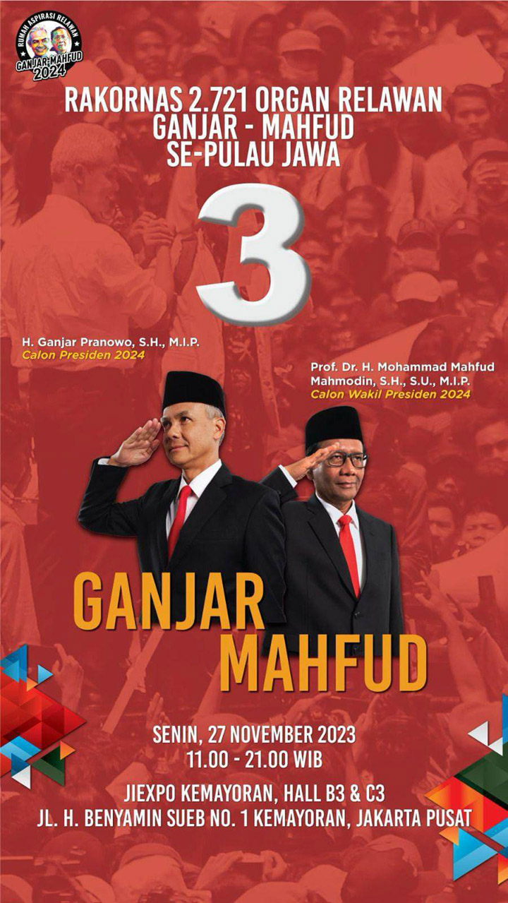 Kehadiran organ relawan Ganjar-Mahfud tersebut, dalam rangka mengikuti Rapat Kerja Nasional (Rakornas) 2721 organ relawan Ganjar-Mahfud se-Pulau Jawa yang dilaksanakan di JIEXPO Kemayoran, Jakarta Pusat, Senin (27/11/2023).