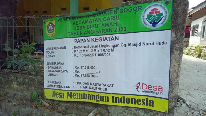 BOGOR, INDONEWS – Pembangunan dari dana desa (DD) tahap satu tahun 2023 Desa Cikutamahi, Kecamatan Cariu, Kabupaten Bogor disoal.